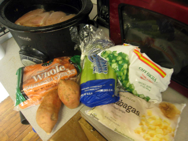 Instead of my regular sweet potato, carrot, and beans, I get sweet potato, carrot, okra, rutabaga, and celery - mmmmmmmm